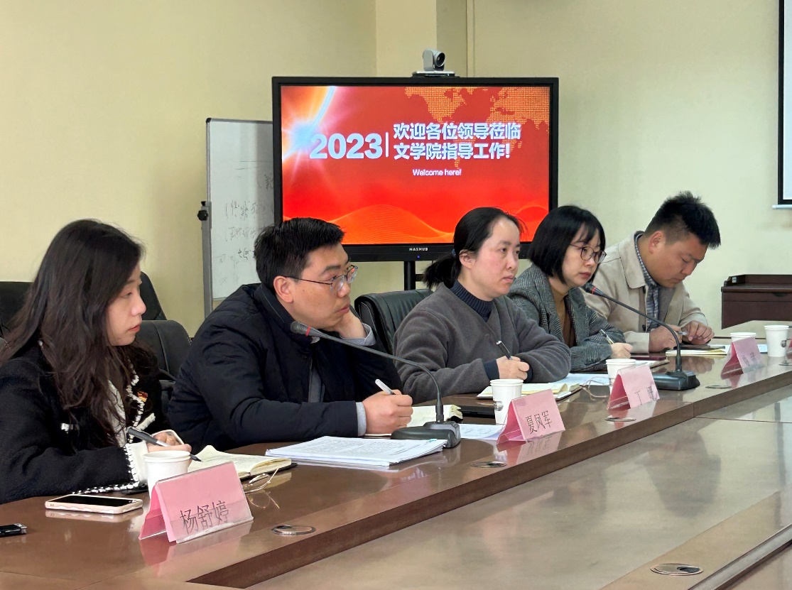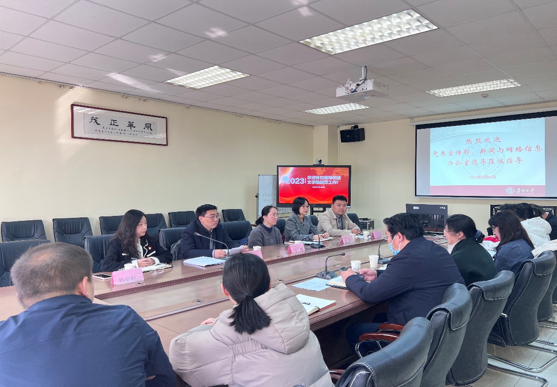 2023年3月16日上午,校党委宣传部副部长夏凤军、新闻与网络信息办公室副主任丁珊、新媒体中心科长刘金光、宣传文化科科长姚臻、副科长杨舒婷一行来黄色网 调研指导工作。学院党委书记宋清华、党委副书记阴浩、办公室主任于大伟以及学院唐文治书院全体辅导员参加了座谈。
