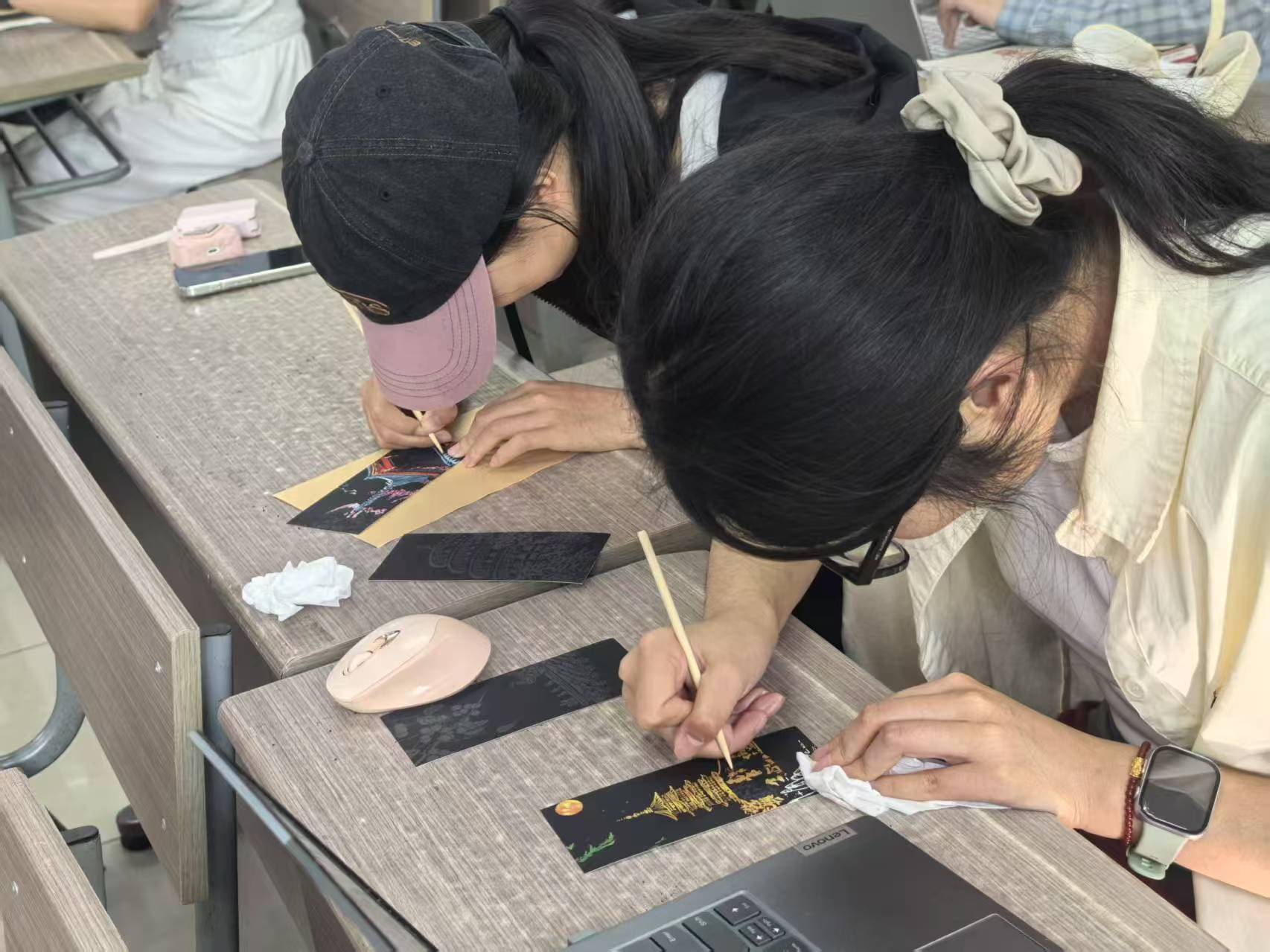 然后来到了同学们期待已久的刮画创作环节。主持人把创作所需的刮画纸和竹签依次分发给同学们,宣布刮画创作正式开始。同学们低着头,拿着竹签在刮画纸上轻轻地划着,非常认真。江南四大名楼渐渐在同学们的刮画纸上呈现出色彩,彰显着深沉的历史底色。