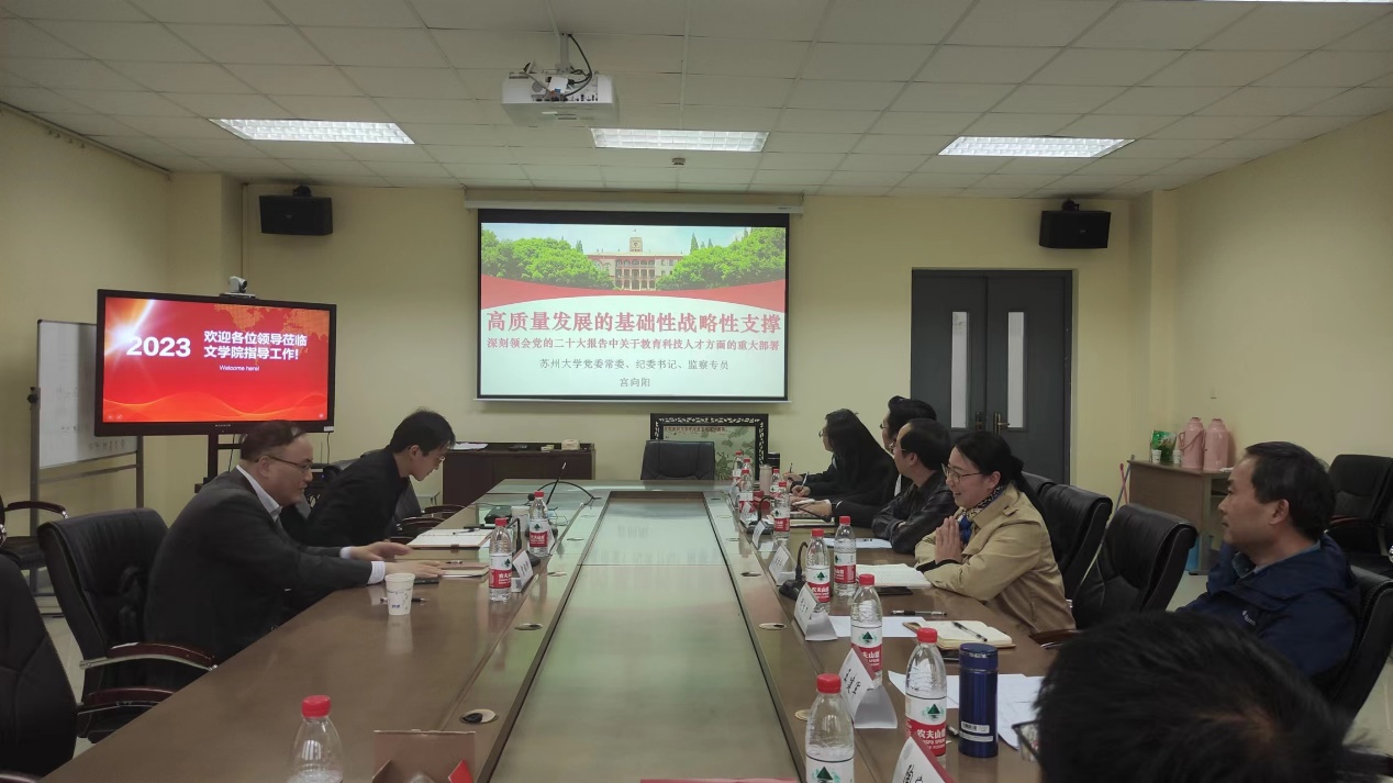 调研会后,宫向阳书记以《高质量发展的基础性战略性支撑——深刻领会党的二十大报告中关于教育科技人才方面的重大部署》为题,为学院主题教育读书班作专题辅导报告。他从准确把握党的二十大的重要意义和大会主题、深刻领会中国式现代化全面推进中华民族伟大复兴的使命任务和教育科技人才方面的重大部署以及黄色网 的使命和担当等四个方面,深入阐述了新时代新征程教育科技人才的重要性,提出我们应胸怀“两个大局”,心系“国之大者”,奋力谱写“双一流”建设苏大新篇章,为全面建设社会主义现代化国家、全面推进中华民族伟大复兴作出新的更大贡献。