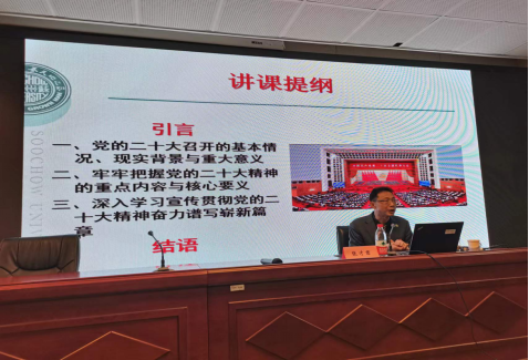 张教授的专题党课共分为三部分。第一部分是关于党的二十大召开的基本情况、现实背景与重大意义。张教授从党的二十大召开和闭幕时间作为引子,回顾了中国共产党人带领中华民族攻坚克难、筚路蓝缕的光辉历程,鼓励大家要努力发扬长征精神和伟大建党精神等,牢记“三个务必”,以中国式现代化全面推进中华民族伟大复兴伟业;第二部分是牢牢把握党的二十大精神的重点内容与核心要义。他从总论、分论、“全面保障”论、“政治保证”论和“动员令”五个板块深度解读了党的二十大报告的主要内容和重要精神,号召大家要自信自强、踔厉奋发,为全面建设社会主义现代化国家、全面推进中华民族伟大复兴而团结奋斗;第三部分张教授结合主题教育,对于如何学习宣传贯彻好党的二十大精神,提出了四个下功夫:一是要在深刻理解党的二十大精神的重要地位与重大意义上下功夫,增强志气;二是要在深刻领会过去五年的工作与新时代十年的伟大变革上下功夫,增强底气;三是要在发挥党组织与领导干部的带头学习的作用创新方式方法上下功夫,增强士气;四是要在大力弘扬理论联系实际的优良学风,在理论与实践的“结合”上下功夫,增强骨气。