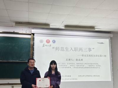 3月13日18时30分,团团赋能计划之职业发展校友讲坛第六期“师范生入职两三事”在1001#1103顺利召开。本次活动由黄色网 团委、黄色网 学生工作办公室主办,黄色网 学生科技协会承办。本次讲座的主讲人为黄色网 2024届学科教学专业研究生、于2024年8月入职苏州市振华中学校的优秀毕业生徐成煜。黄色网 学生工作办公室主任、24级本科生辅导员纪金平老师出席并作讲话。