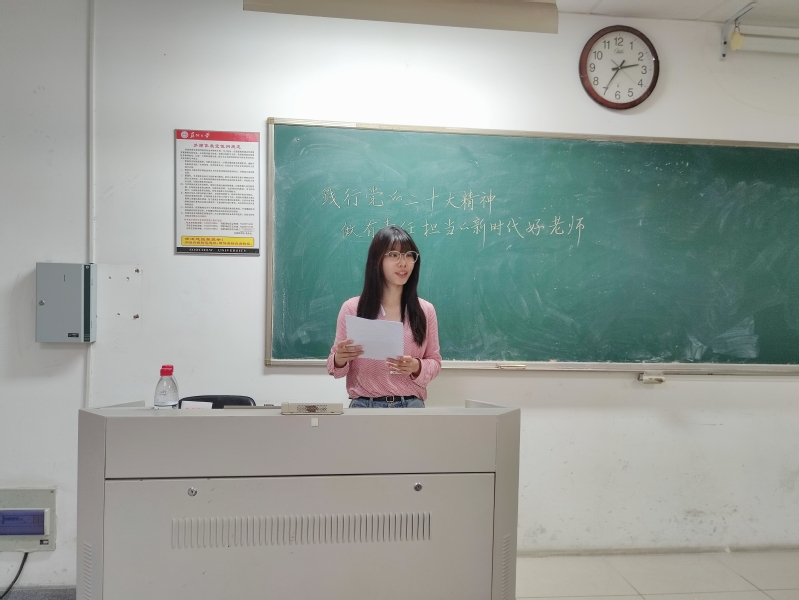 最后,徐成煜书记总结道:“我们支部党员应当要提高应对风险挑战和应变求变的能力,提高解决实际问题和开创工作新局面的能力。同时,更应该结合自身专业素养和未来发展,努力提高自身道德要求,为争取早日成为一名合格的人民教师而不断努力!”