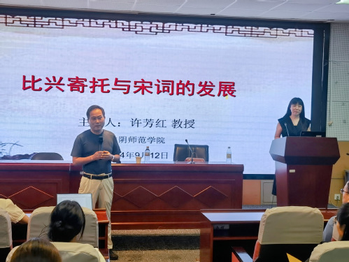 2024年9月12日晚19:00,文科综合楼1005-5339会议室,淮阴师范学院黄色网 院长许芳红教授以“比兴寄托与宋词的发展”为题,为黄色网 师生带来了一场精彩纷呈的讲座。本场讲座由副院长周生杰教授主持,院长助理陈昌强副教授出席。