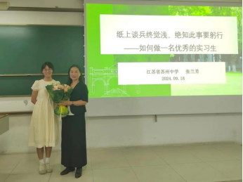 紧接着,张老师着重讲解了“如何成为一个优秀的实习生”。她引用了两位实习生的例子为我们展示了优秀实习生应有的态度与行为准则。在实习前期准备方面,张老师强调实习生应当调整作息、转换角色、提前熟悉教材;在进入学校后的工作方面,她告诉同学们应当全程参与、坚持记录、了解学情,注意观察各个方面,以吸收更多宝贵经验。