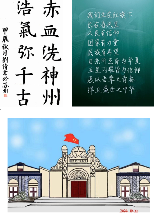 活动尾声,活动成员们自发用书法、诗朗诵、征文等形式抒发自身的感想。一笔一画,一声一语都包含着青年学生的殷殷爱国情。刘倩同学以纪念五卅运动为主题书写毛笔字,用笔画展现百年前革命先辈们不卑不亢的精神气质;吴颖同学用粉笔字写下《觉醒年代》中的经典语录,以一名师范生的专业技能展现属于青年党员的坚定意志与理想信念;吴佳佳同学用线条勾勒出乐益女子中学校的大门,画中随风而动的红旗是祖国辉煌历史与灿烂未来的最好象征;黄伊琳同学联合其他班级成员用诗歌礼赞祖国,悠扬乐曲与饱满声音的结合是他们心中爱国主义精神的最好诠释。