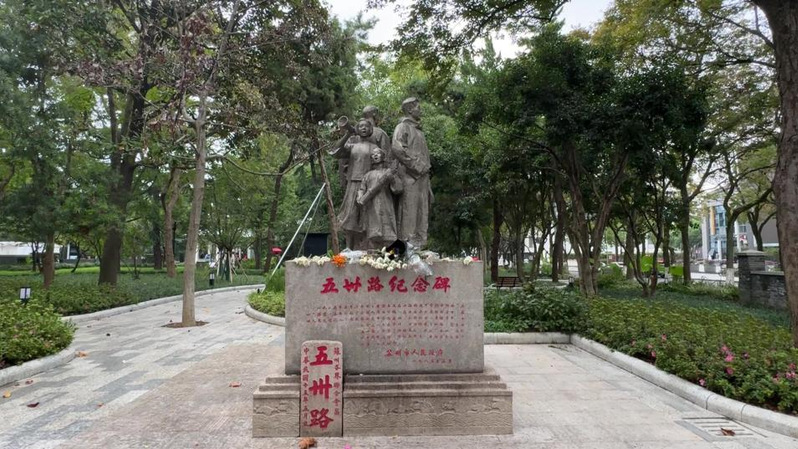 站在五卅路牌下,刘泓柏同学将其命名缘由娓娓道来。1925年,五卅运动在上海爆发,并很快席卷全国,这是中国共产党领导下的群众性反帝爱国运动,而五卅路是全国唯一一条为纪念五卅惨案而命名的道路,是苏州革命历程的见证。伴随着淅淅沥沥的雨声,我们走在这条具有深厚历史文化底蕴的道路上,它依旧保有那份历史的厚重感与生命的庄严感。在党旗的引领下,我们迈步向前。现如今的五卅路又展现出新的风采,成为了一个集交通、文化、商业于一体的现代化道路。时光荏苒,古老与现代的融合,让五卅路形成一种特有的文化氛围。历史并不遥远,承载人民记忆的五卅路会乘着时代的新风继续闪耀它的文化光辉。