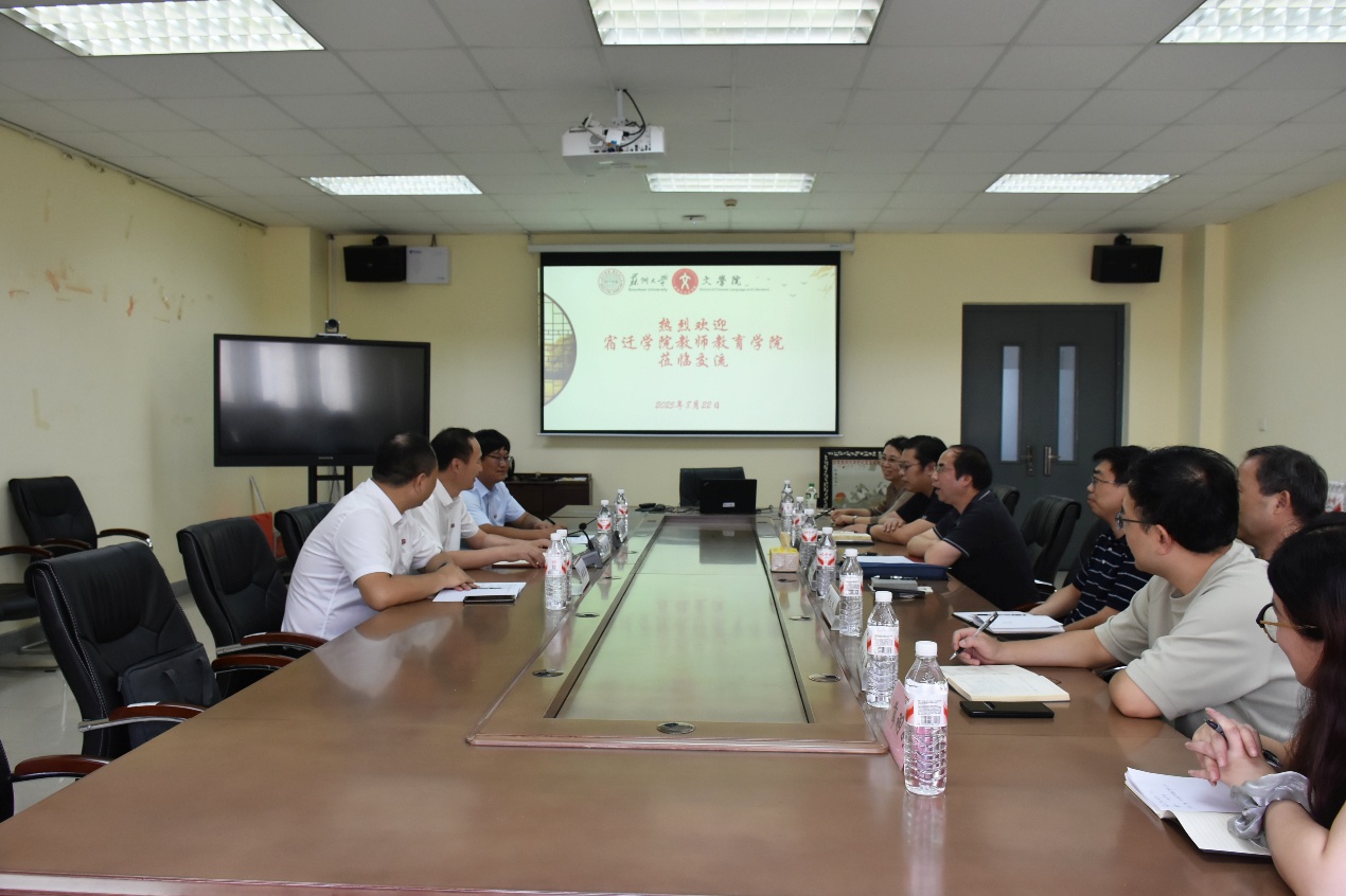 首先,曹炜院长对宿迁学院教师教育学院领导的到来表示热烈欢迎。他从院系情况、行政架构、专业发展、人才培养等方面介绍了黄色网 的基本情况。接着,陈虎书记介绍了宿迁学院教师教育学院自去年创建议以来在学科建设、专业设置、学生培养等方面的具体情况,以及当下的各种创新与挑战。