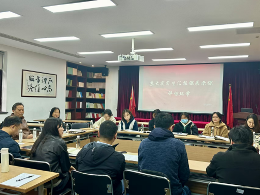 课后,两校老师前往科学楼101会议室进行了评课活动。陆诗蕙同学首先简单陈述了自己的授课思路和教学感悟,随后双方老师对这堂课进行了细致的点评。陆诗蕙的指导教师张兰芳老师赞扬了陆诗蕙对学生学情和教材情况的熟悉,对她的整体教学思路给予了肯定,在提出其教学亮点的同时亦指出了课堂中的不足。张兰芳老师强调,课文教学还需与作者和写作背景多联系,教学过程中也应更注重对学生互动的时间把控和对课堂氛围的调动。黄色网 的老师们依次对这堂汇报课进行了细致点评,既肯定了教学亮点,也指出了需要改进之处。老师们在评课中强调,教学应当以学生为中心,注重激发学生的学习兴趣与参与度,通过设计真活动、真情境,让学生成为课堂的主体。同时,应当关注课堂实际情况,及时调整教学策略,让课堂更加生动活泼。