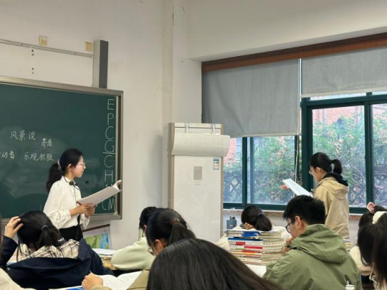 担任本次汇报课主讲的是实习生陆诗蕙同学,她展示了高三语文《风景谈》的教学。在课堂中,她通过电视剧《我的阿勒泰》主题音乐生动导入,引出了“风景中的人”,并在之后结合学生的预习作业,设计了三个有趣的活动,引导学生梳理散文中“人与景的关系问题”“议论段的作用问题”以及“作者写作意图问题”。课堂最后陆诗蕙采用联读的教学方法,将《风景谈》与学生学过的《故都的秋》《我与地坛》等散文巧妙的结合,有意识地对课内知识进行进一步的深化和拓展。整个课堂行云流水,环环相扣,轻巧却扎实,有效地激发了学生的语文学习兴趣,潜移默化中培养了学生的审美鉴赏能力,展现了实习生的专业素养和个人教学风采。