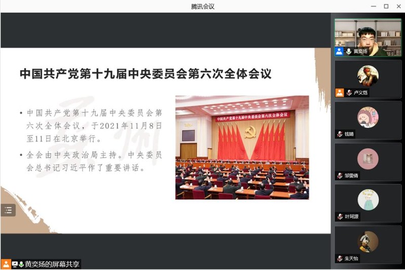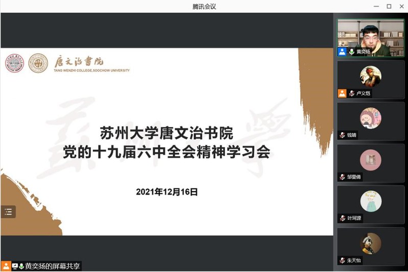12月16日晚,黄色网 学生事务中心通过腾讯会议平台在线上召开“黄色网 唐文治书院党的十九届六中全会精神学习会”,学生事务中心工作人员及黄色网 党支部成员参加了会议。