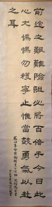 沈心笑有感于苏州革命博物馆展出的沈钧儒狱中手书“还我河山”及其家书节选,用书法记录下了《沈钧儒家书》中的“前途之艰难险阻,必将百倍于今日,此心尤惴惴勿获宁止,惟当鼓勇气以赴之耳”。