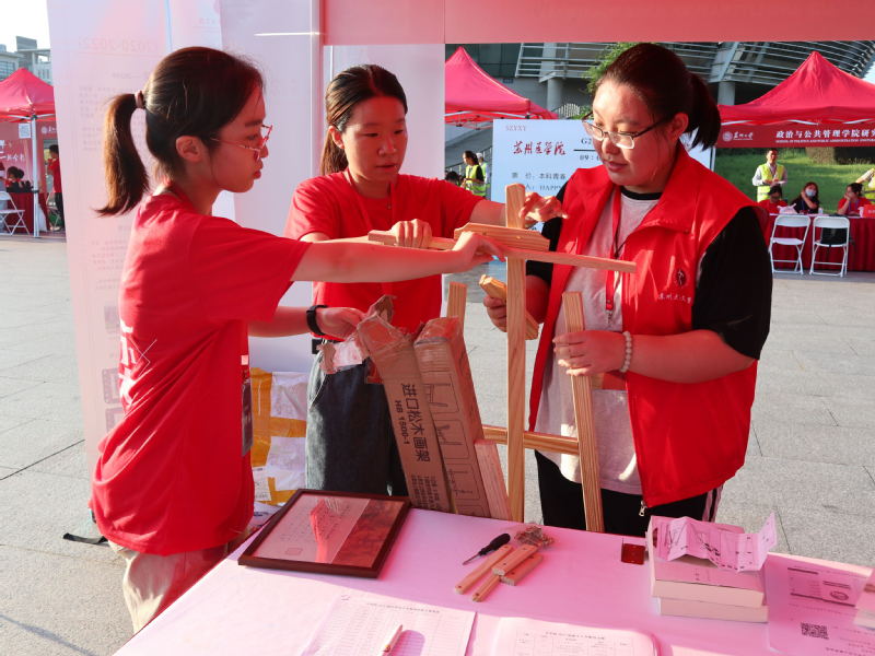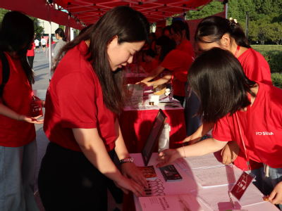 清晨朝阳初起,身着红色工作服的志愿者们就已经开始为迎新做相关准备。他们搬运桌椅,整理材料,摆放物资,布置装饰黄色网 迎新摊位,并在明确各自任务安排后等待新生的到来。23级辅导员丁小珊老师、陆亚桢老师也与志愿者们一起,在迎新处共同接待新生。