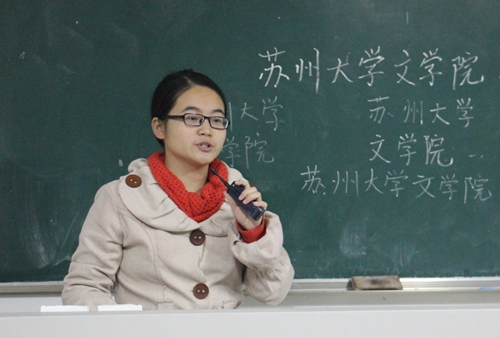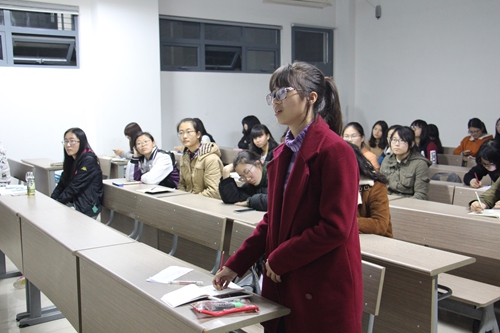 李梦洁同学以“师范实习早知道”为标题开始了这次的分享交流。首先,她指出大学学习成绩的重要性,并向大家介绍了一些实习学校的大致情况,例如:工业园区星港学校、西交大附中、园区一中等。然后,她分享了一些实习中的教学经历,其中,在小学中做实习语文老师的一些有趣经历更是让在场的同学们捧腹大笑。她提出“负责”“用心”在教学中是非常重要的品质,在实习中,她认真地评价回复班级同学写的每日随笔,赢得了家长的褒奖;她背下需要教授的课文,得到了同学们的肯定。