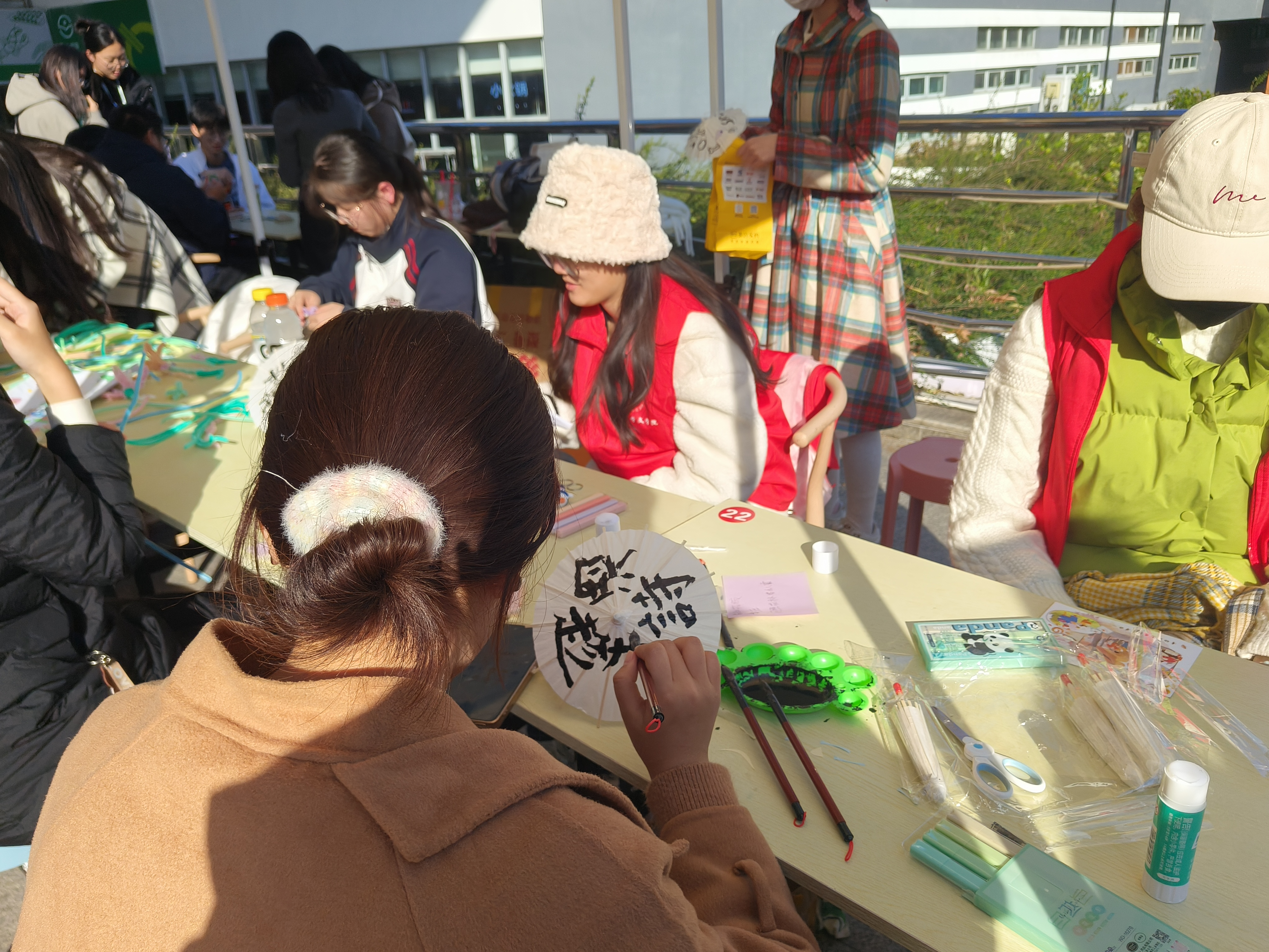 游戏环节以“巧折妙剪”制作剪纸伞活动收尾。整个过程中,制作者静心坐于阳光下,拿起剪刀,挥毫点墨,完成自己的志愿剪纸。通过剪纸活动,实现志愿活动与传统文化的结合。