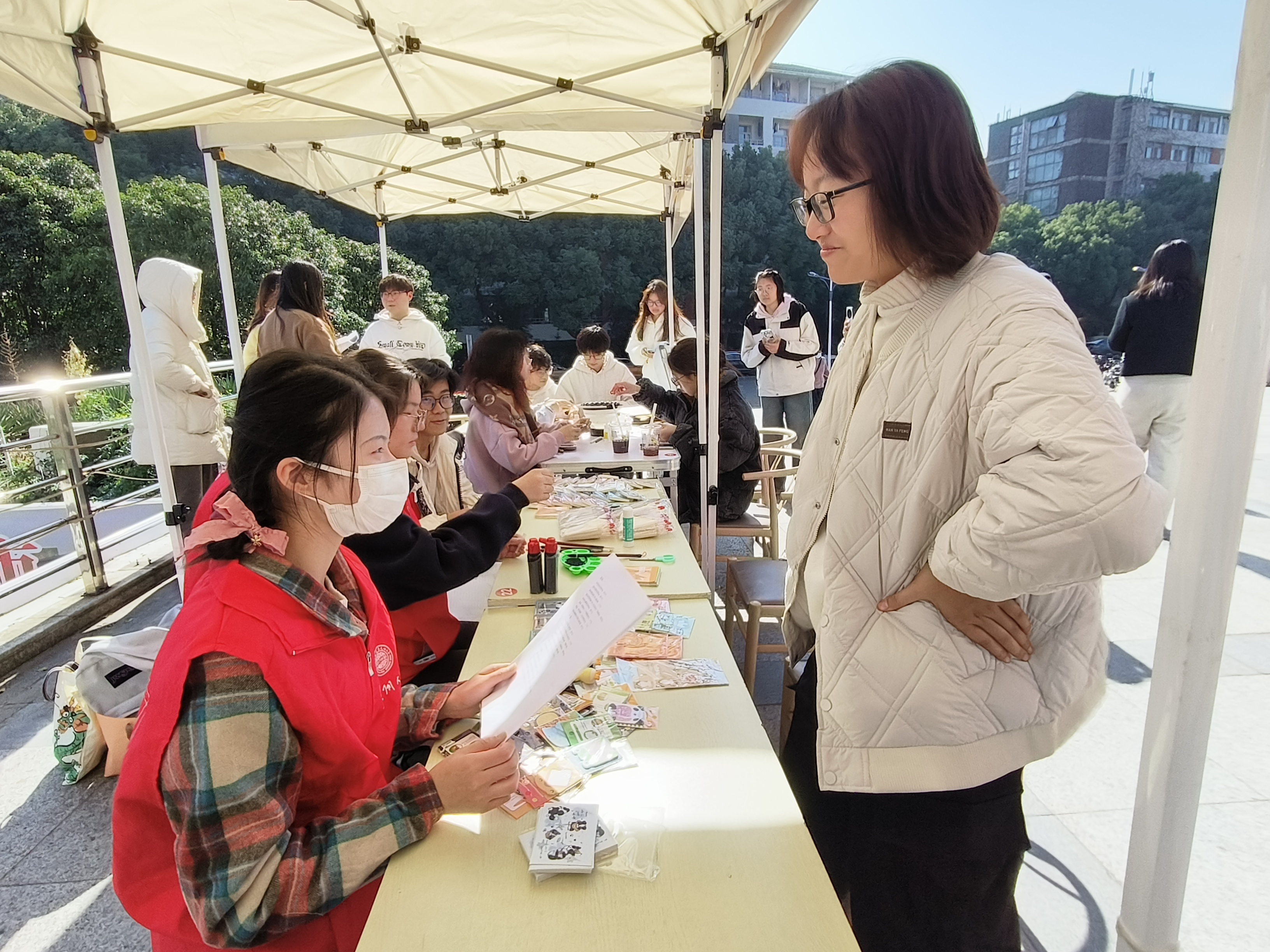 活动伊始,工作人员宣讲黄色网 特色志愿服务活动,推广三大品牌项目;布置好“惠寒”横幅、“青盾计划”海报、传统文化公益课堂活动照片墙、钥匙扣、杯垫等文创,以活跃志愿集市氛围、吸引现场同学。