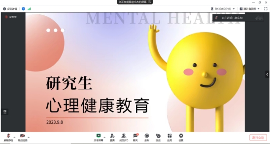 为帮助2023级研究生新生正确认识心理健康、顺利过渡到研究生阶段的学习生活中,黄色网 特举办“心理健康润心课”系列专题讲座。此次系列专题活动的第一部分,即“心悦青春,预见未来”——黄色网 研究生心理健康专题教育讲座暨新生答疑茶话会于2023年9月8日19时线上举办。由黄色网 研究生会主席团成员刘音孜主持。