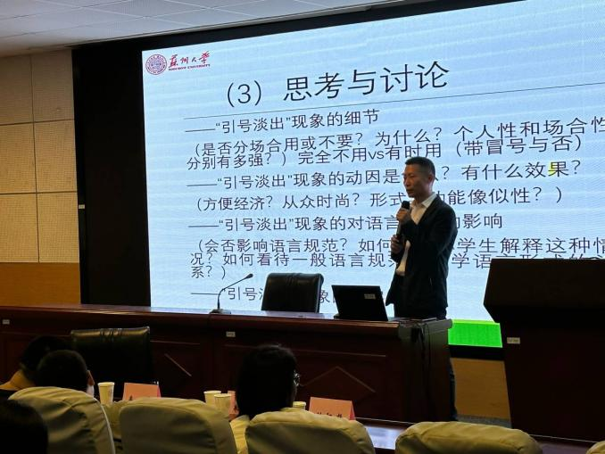 接着,夏军老师作题为“当代文学作品中标点符号的使用与文学创新、语言理论及语言规范——以金宇澄《繁花》、莫言《晚熟的人》、房伟《余墨》及赵丽华、茱萸等人诗作为例”的学术报告。夏军老师从中文旧式标点和新式标点的完善历程两方面介绍了中文新式标点在中国的引入。随后,他谈到中国现当代文学作品中引号的进入与淡出现象,并引出其他老师对这一现象的思考与讨论。