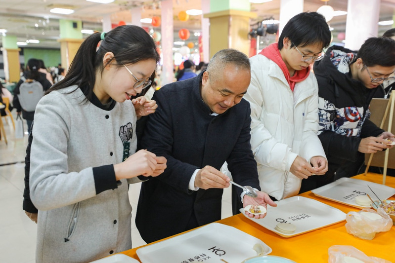 校党委常委、副校长查佐明老师亲临现场,亲切慰问黄色网 师生和忙碌的现场工作人员以及食堂师傅们,用“暖暖胃、暖暖身、暖暖心”给现场师生送上节日的祝福,并和同学们一起包饺子,聊家常,话冬至。