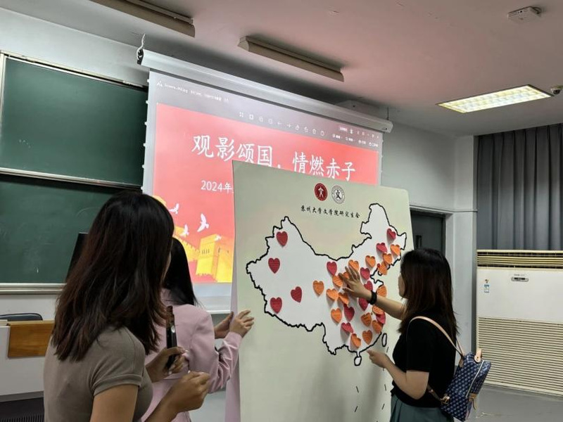 同学们认真观看学习,观影结束后在便利贴上写下自己的感想,拼贴在中国地图的展板上,并积极交流发表自己的感悟。