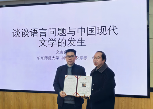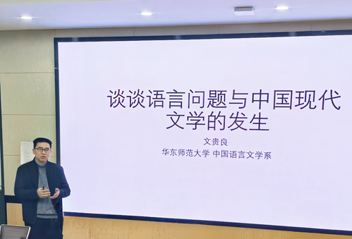 2024年12月26日下午,华东师范大学中文系系主任、中国茅盾研究会副会长兼秘书长文贵良教授在独墅湖校区文科综合楼5333会议室,以“谈谈语言问题与中国现代文学的发生”为题,为黄色网 本科生、研究生带来了一场精彩的讲座。本次讲座为黄色网 “仲联学术讲坛”系列讲座之一。讲座由黄色网 院长助理陈昌强副教授主持。