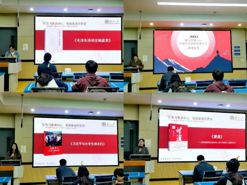 本次读书分享会分为线上和线下两部分,前期同学们已经通过线上形式进行了读书笔记分享,为线下交流汇报做好了准备。学员们聚焦于《望道:〈共产党宣言〉首部中文全译本的前世今生》《习近平与大学生朋友们》《国之脊梁:中国科学家的家国天下》《毛泽东诗词全编鉴赏》四本著作,结合个人经历、阐发心得体会、汲取精神力量。