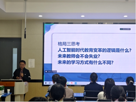 周建忠教授首先从教学经历出发,以自己所作的数首诗词作为开场,继而指出了当今教育所面临的时代思考:人工智能时代教育变革的逻辑是什么?未来教师会不会失业?未来的学习方式有什么不同?随即从团队合作、生产知识、专业自主、教育政策四个方面提出了建设性意见。