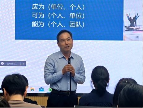 紧接着,周建忠教授从“八化偕行”的角度对国家新文科建设要义进行深入解读,强调国家新文科建设要注重马学化、中国化、时代化、科技化、人性化、社会化、国际化、思政化。针对江苏新文科建设,周建忠教授指出,学院发展和建设要围绕四个计划:教育教学体系创新计划、交叉人才培养先锋区建设计划、新文科大讲堂计划、“悦读经典”——江苏大学生读书行动计划。
