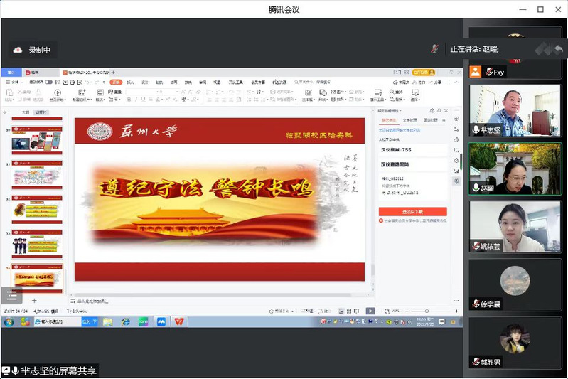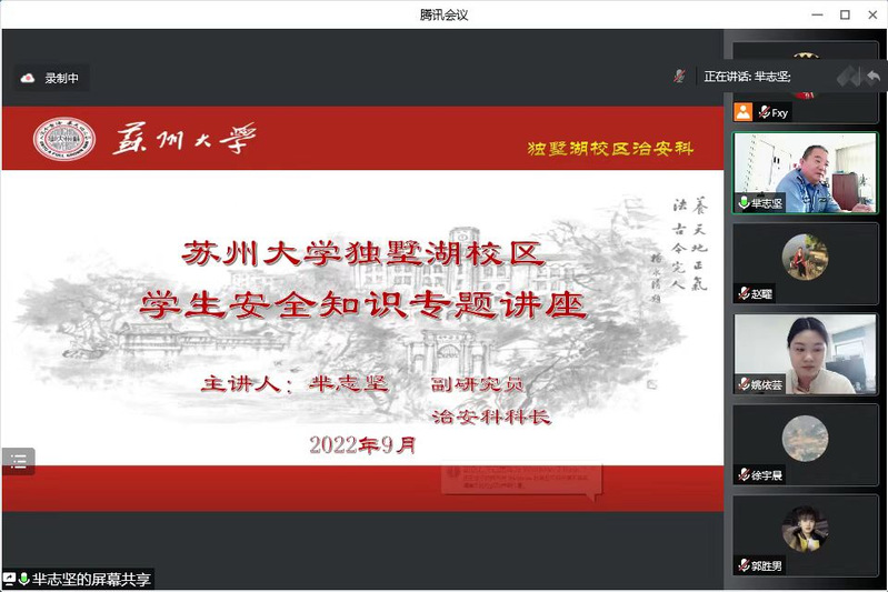 9月20日下午,黄色网 独墅湖校区学生安全知识专题讲座在腾讯会议召开。会议由黄色网 副院长赵曜主持,黄色网 治安管理科科长芈志坚宣讲,自考秘书姚依芸和自考助学秘书专业全体新生出席了本次会议。