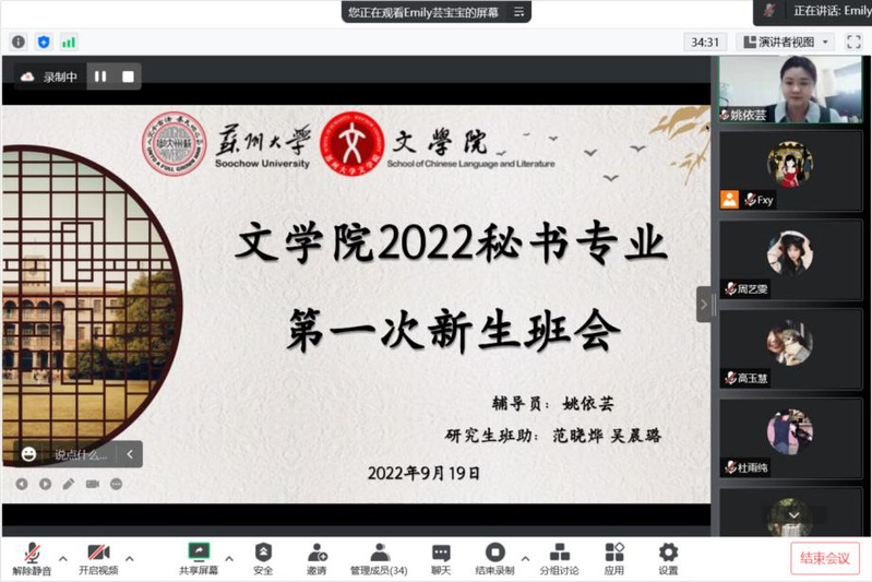 9月19日下午,由2022级自考助学秘书专业辅导员姚依芸老师主持的22级秘书学自考新生第一次班会在腾讯会议召开,全体新生及两位辅导员班助范晓烨、吴晨璐出席了本次会议。新生班会主要分为五个部分:导员和班助自我介绍、黄色网 概况、规章与制度、苏大食住行、班委竞选演讲。