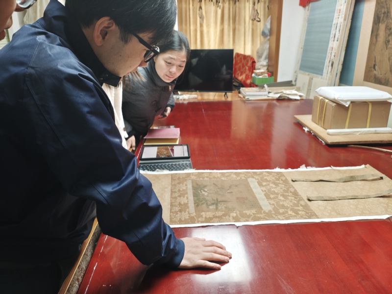 活动当日,同学们聚集在工作室中,结合视频介绍,聆听苏裱师傅周根林、周斌先生关于苏裱技艺方面的讲解。幽幽古城,孕育装裱技艺。时至今日,苏裱技艺已被列入国家级非物质文化遗产名录,闻名于日本、东南亚及国外的华侨聚集地,声名远播,影响深远。通过两位师傅展示的修复成果,咫尺之间,指尖触碰再焕新颜的艺术珍品,同学们了解到苏裱材料精良、配色文雅、装制熨帖、整旧得法、形式多样、裱工精妙的特点,亦知匠人坚守传承、锤炼技艺、薪传不易。
