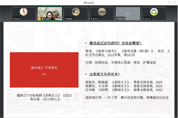 在讲解正确引用文献时,张老师精心设计“TVB《新闻女王》”和“喜羊羊与灰太狼”趣味案例,逐一分析直接引用、间接引用等不同情境下的规范操作,提醒同学们在写作时若从课堂讨论、交流乃至网络平台获取灵感,也应本着诚实负责的态度,在致谢或注释中予以说明,这不仅是规范,更是良好学术品格的体现。