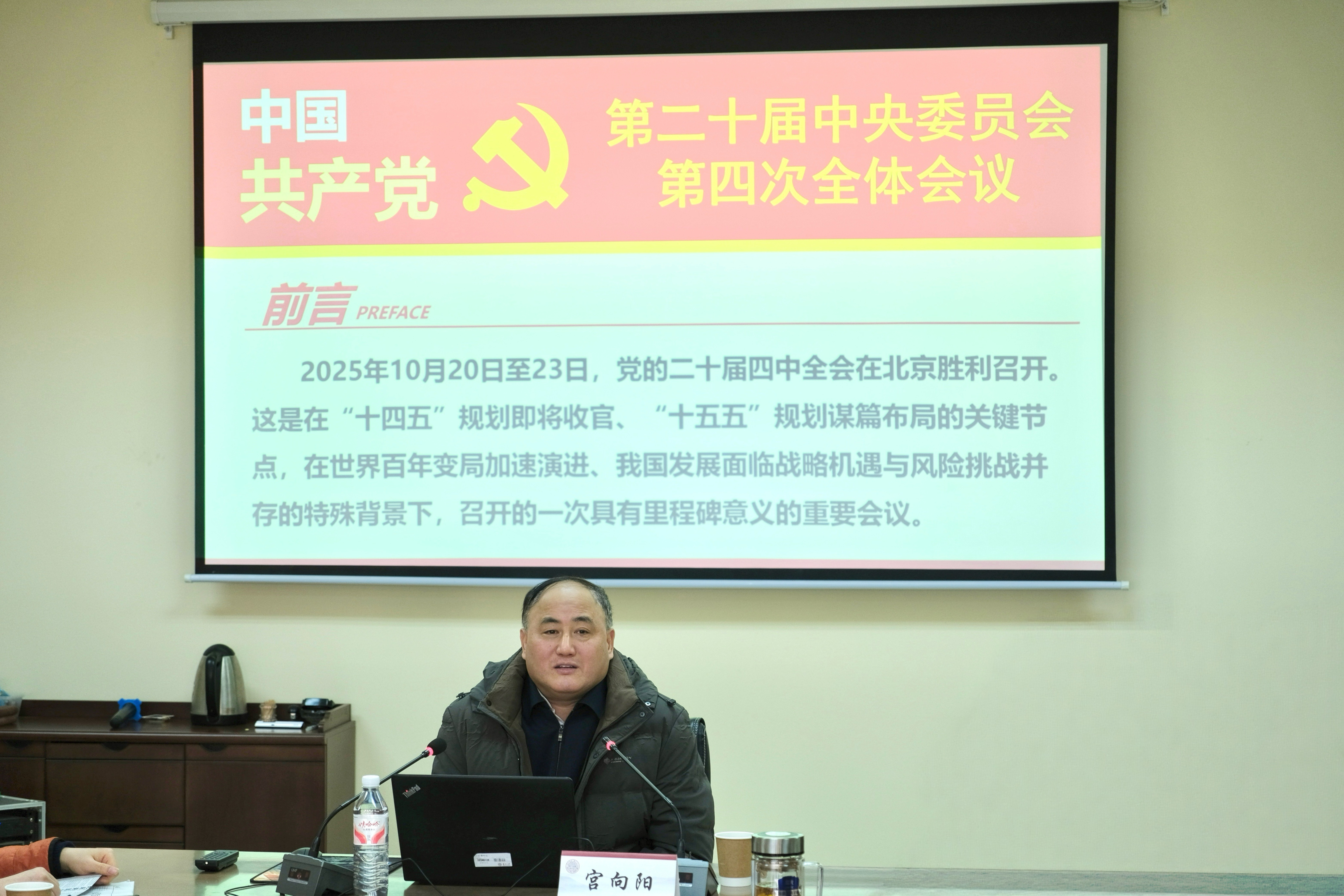 宫书记从五个方面对全会精神作了深入解读:一是回顾了党的四中全会的历史沿革和制度定位,指出党的二十届四中全会站在“十四五”圆满收官、“十五五”谋篇开局的关键节点,意义重大、影响深远;二是深入阐述习近平总书记和党中央高度重视“十五五”规划编制的战略考量,强调这是推进中国式现代化承上启下的关键五年,必须增强历史主动、把握发展大势;三是系统回顾“十四五”时期我国经济社会发展取得的重大成就,从经济高质量发展到科技自立自强,从民生持续改善到生态文明建设,充分彰显了中国特色社会主义制度的显著优势和强大生命力;四是重点解读全会擘画的“十五五”发展蓝图,强调要坚持以高质量发展和高水平安全统筹推进为主线,加快培育新质生产力、扎实推进共同富裕、完善国家治理体系;五是结合高校职责使命,从学深悟透、对标对表、问题导向、党建引领等四个方面提出了贯彻落实党的二十届四中全会精神的实践路径。