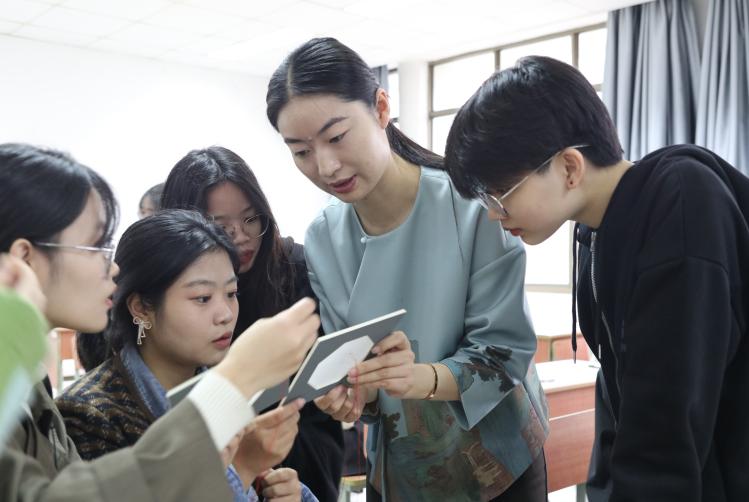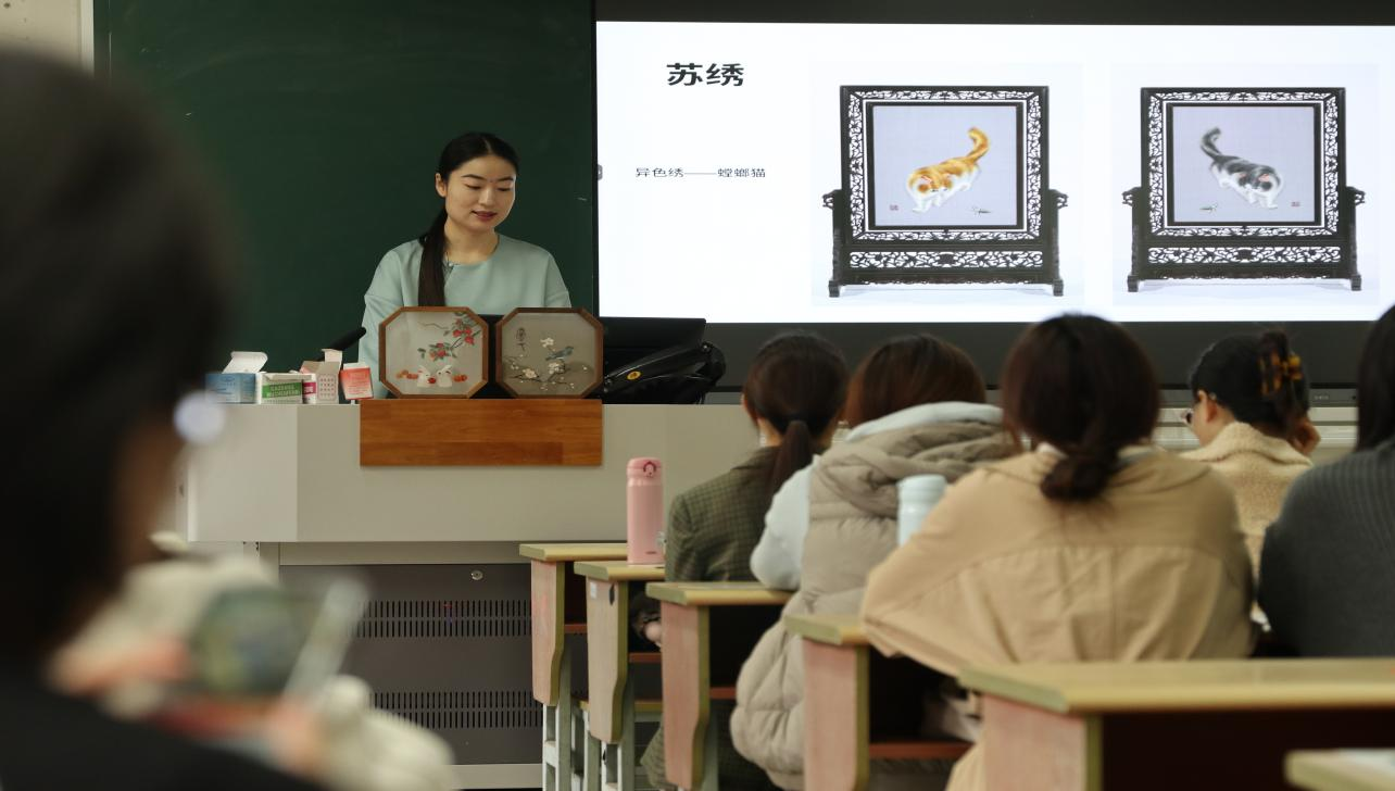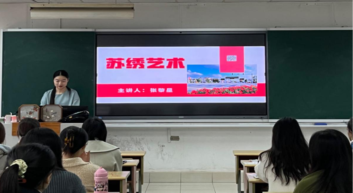 明代王鏊在《姑苏志》中对苏绣有“精、细、雅、洁”的评定,认为苏绣“精细雅洁”的背后正是绣娘技艺和时间的积累。“从太湖边上的一位小绣娘,到在苏绣研究所求学的学子,最后成为开办苏绣学校立志传播、创新苏绣文化的大家。”张黎星老师将苏绣大师卢福英“一生只做刺绣一件事”的故事向同学们娓娓道来。走过长达50年的刺绣艺术生涯,卢福英感谢刺绣这门手艺带给她的人生态度,同时也在时间流逝与技艺纯熟之间不停思考如何将刺绣推向一个新的高度。