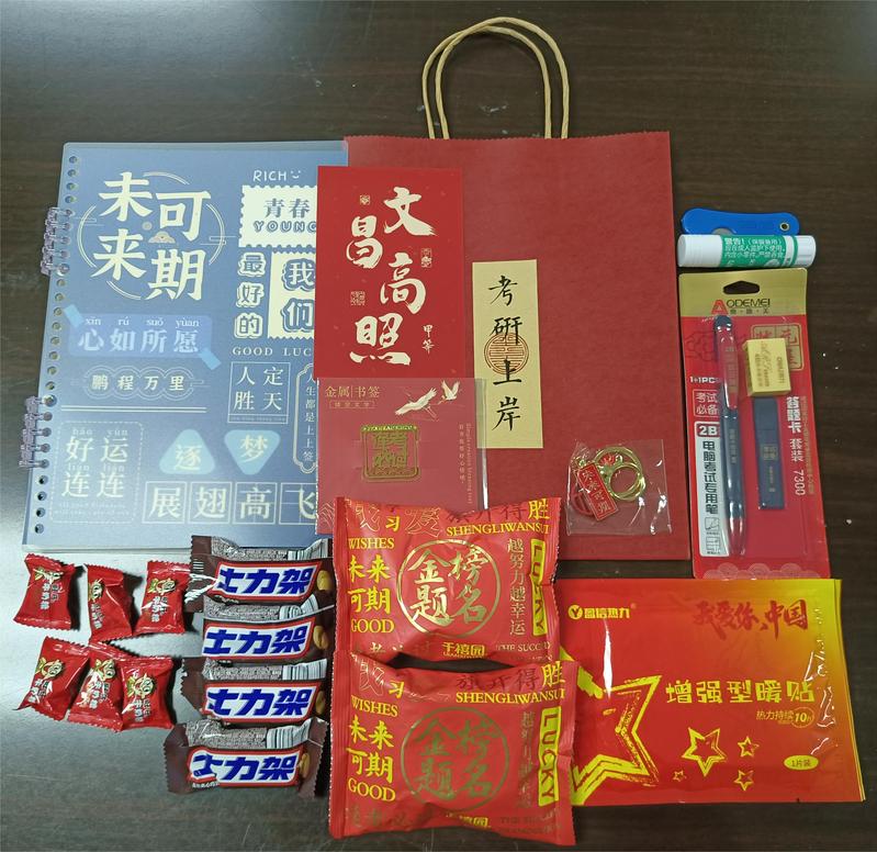 最后,学院领导、老师还给同学们送上了充满祝福寓意的“考研大礼包”,每一份都由学院老师和志愿者亲手组装。大礼包中有笔记本、考研所需文具、书签、钥匙扣、暖宝宝、零食等,希望在寒冷的冬天让依旧坚持在考研前线的同学们感到温暖,并鼓励同学们在考研路上坚定信心、披荆斩棘。