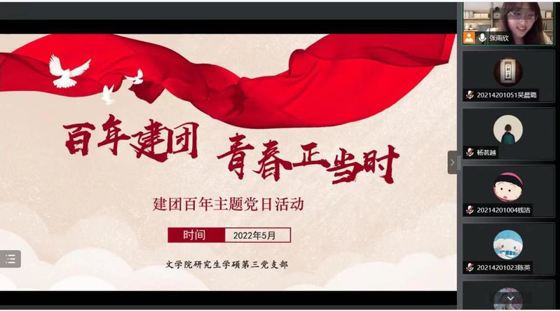 5月10日,习近平总书记出席庆祝中国共产主义青年团成立100周年大会并发表重要讲话,全面回顾了100年来共青团坚定不移听党话、跟党走的青春历程,充分肯定了共青团在党的领导下、团结带领一代代团员为实现中华民族伟大复兴中国梦所作出的重要贡献,深刻阐明了共青团和青年工作的历史经验,对做好新时代共青团工作提出明确要求。黄色网 研究生学硕第三党支部于2022年5月16日线上开展“百年建团 青春正当时”主题党日活动,结合学习内容和社会时事,围绕如何做一名德才兼备的社会主义建设者和接班人、党的忠实助手和忠诚后备军等话题深入展开研讨。会议由支部书记季鹏飞同志主持,支部全体党员参加。