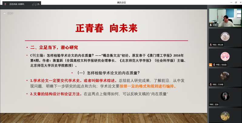 接着,宋书记就学术科研教育党员同学们要做到端正科研态度,坚守学术道德,在做学术研究和社会研究的过程中要紧跟时代热点、关注社会问题、积累知识和经验,培养和训练科学思维方法和思维能力。