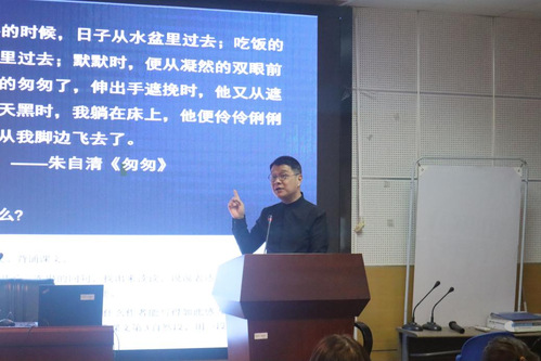 接着,肖培东老师指出,上一堂“艺术的语文课”需要教师把“符合语文教学的规律”与“符合语序学习的规律”融合起来,尊重每一位学生的个体差异,善于引导,巧于点拨,精于激趣,把语文课教“活”。肖老师以《匆匆》一课为例进行教学示范,向同学们展示如何基于学生学情设计有趣的的课堂情境、提出值得学生思考的问题。