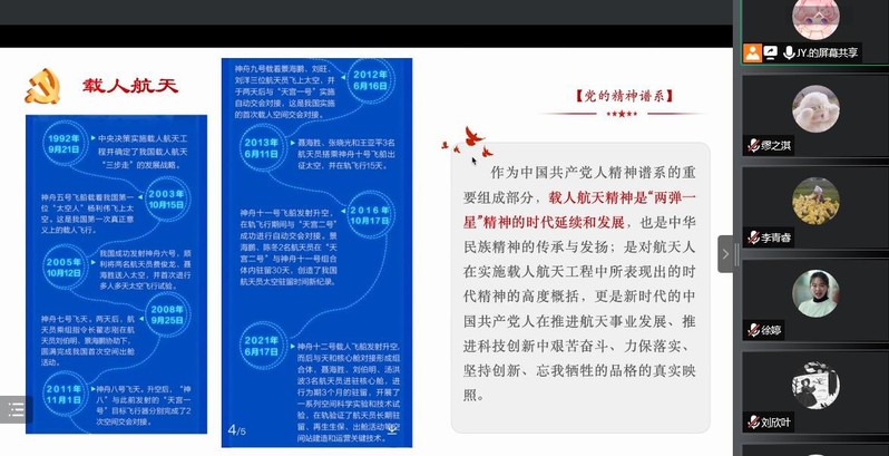 本次会议由支部书记范佳玥进行领学。首先,她带领大家载人航天精神和习近平总书记对航天事业的深情寄语。载人航天是当今世界高新技术发展水平的集中展示,是衡量一个国家综合国力的重要标志。上世纪90年代初,党中央高瞻远瞩、审时度势,作出实施载人航天工程的重大战略决策。经过几代航天人的接续奋斗,我国航天事业创造了以“两弹一星”、载人航天、月球探测为代表的辉煌成就,走出了一条自力更生、自主创新的发展道路,积淀了深厚博大的航天精神。“特别能吃苦、特别能战斗、特别能攻关、特别能奉献”成为了载人航天精神的深刻内涵。