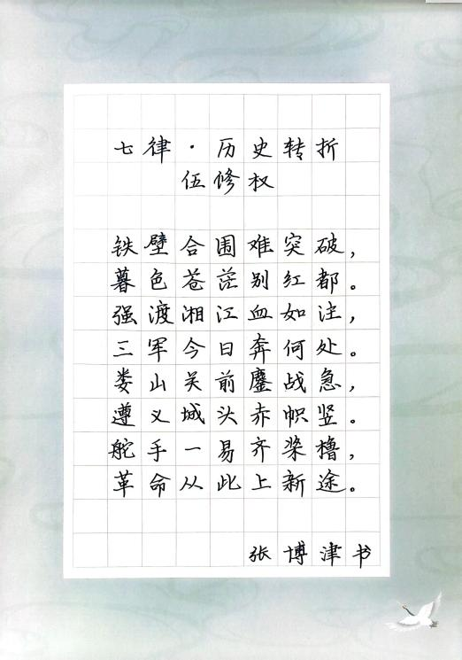 【创作灵感】1935年1月,中共中央政治局在贵州遵义召开扩大会议,总结第五次反“围剿”失败的经验教训。会议期间,他创作了《七律·历史转折》一诗。遵义会议在极端危急的关头挽救了党、挽救了红军、挽救了中国革命,是党的历史上生死攸关的伟大转折。2023级硕士研究生张博津认为,遵义会议精神集中展现了中国共产党人的优秀品格,是建设中国特色的社会主义事业的强大精神动力,很值得新时代青年学习。