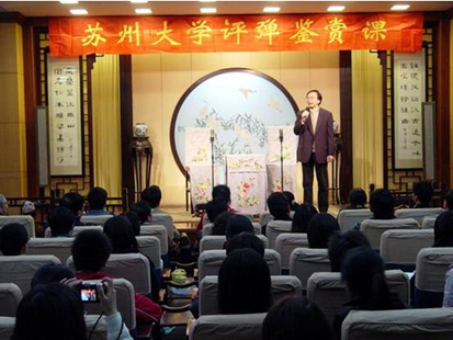 课程分为戏曲和评弹两个部分,一学期中两部分内容交替进行。在评弹课上,盛小云、金丽生、赵开生、周明华、王池良、施斌、吴静,邢氏兄妹邢晏春、邢晏芝,袁小良、王瑾夫妇,这些苏州评弹界的诸位名家纷纷来到苏大,给同学们带来了精彩的表演并向大家讲授了关于评弹的诸多知识。为了让大家亲身体验一下在书场中听书的感觉,还于4月1日组织大家到位于苏州观前街上的光裕书厅听了一场评弹。朱栋霖教授告诉大家,欣赏评弹一定要走进书场,在古典优雅的环境中,静心凝神,方能品味出苏州评弹的神韵。评弹的韵味就像一杯碧螺春茶,清新淡雅,回味悠长。为了满足同学们学唱评弹的愿望,盛小云老师逐字逐句的教同学们学唱弹词开篇《蝶恋花——答李淑一》。同学们纷纷议论早听说苏州评弹好听,但没想到竟是这么让人着迷。