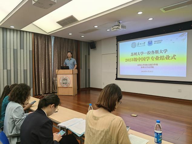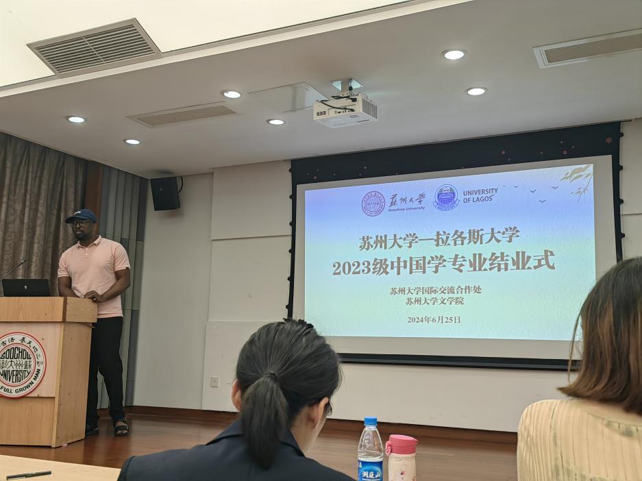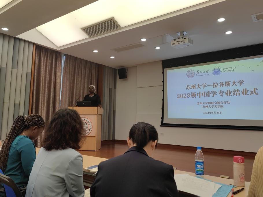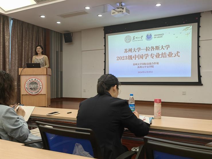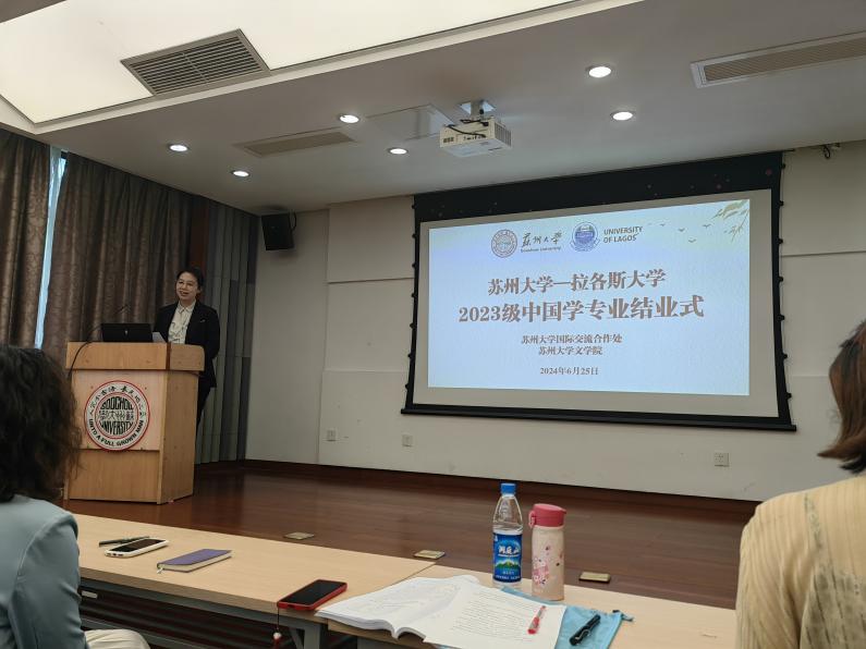 国际合作交流处留学生管理科科长梅琳代表国际处致辞。她回顾了拉各斯学生在苏大一年所经历的美好瞬间,包括国际周表演、端午龙舟赛、足球联赛等中外学生活动,表达了对黄色网 的领导和老师的感谢,希望拉各斯大学的同学们能把在中国所学带回尼日利亚,讲好中国故事,让更多的人了解中国。