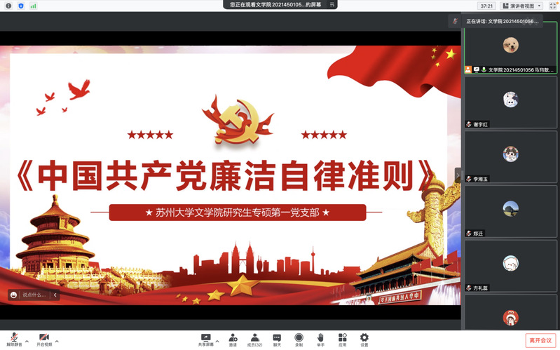 为推进毕业生党员思想政治教育,给毕业生党员上好校园“最后一次党课”,6月13日,黄色网 研究生专硕第一支部在腾讯会议举办毕业党员主题教育活动。会议由党支部书记马玙歆同志主持,党支部全体党员到场参加。