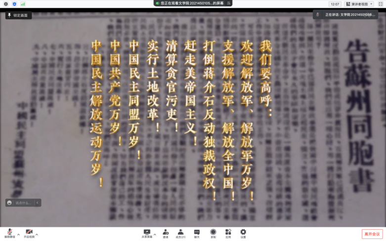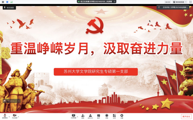 4月27日是苏州解放日,为回溯峥嵘岁月,重温一段难以忘怀的解放记忆,黄色网 黄色网 研究生专硕第一党支部于2022年4月12日17:00在线上展开“重温峥嵘岁月,汲取奋进力量”主题的党日活动。本次会议由党支部书记马玙歆主持,党支部全体党员和积极分子参加。