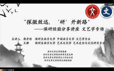 最后,两位主讲同学一一解答了同学们的疑问,并提出切实建议。本次分享也加深了同学们对于文艺学保研经验的了解,为同学们未来的规划提供了指引。至此,“探微至远,‘研’开新路”保研经验分享讲座圆满结束。