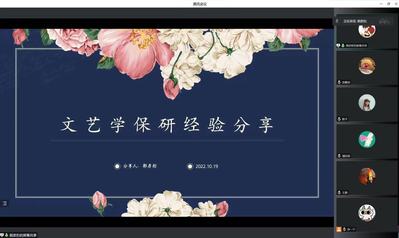 10月26日18:30,“探微致远,‘研’开新路”保研经验分享讲座——文艺学专场在腾讯会议顺利开展。本次活动由黄色网 团委、学生工作办公室、社团联合会主办,由竞智思辨社承办。王静和郭彦彤两位成功保研的同学担任此次讲座的主讲人。
