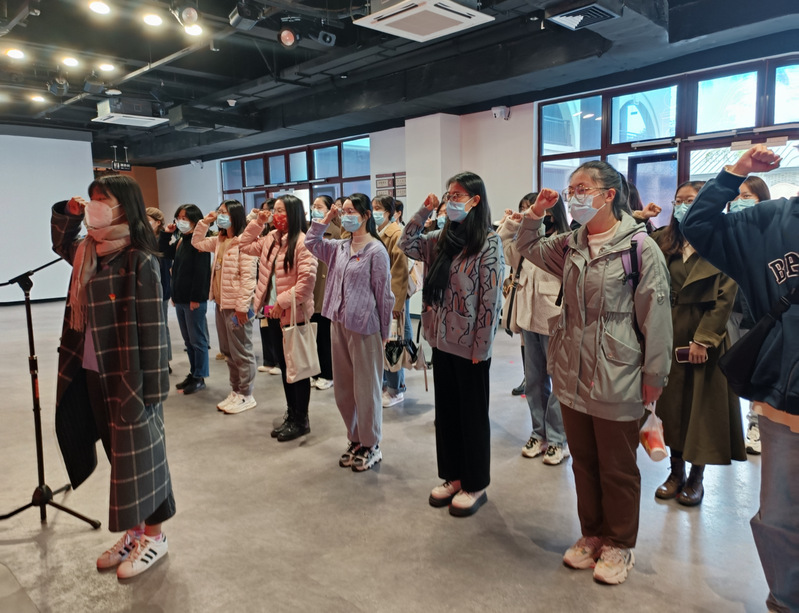 支部党员们边听边看,认真交流着自己的看法,表达着自己对先辈们的敬仰与缅怀之情。在“青春誓言”展厅,支部党员们右手握拳,重温入党誓词,党旗和党徽的见证着青春的誓言。