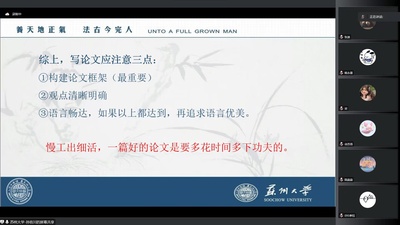 接下来,孙容川对论文的写作做了简要介绍,并从前期准备和动笔写作两个方面进行了详细指导——前期准备时,同学们要做好文献综述,用科学的方法筛选论文和专著;动笔写作时,要将框架结构作为论文写作的基础,让主题和观点清晰明确,让论述内容言之有理、能够自圆其说。在文字运用方面,孙容川强调论文语言应当“文从字顺”,在明白晓畅地表达自己观点的基础上,才能进一步追求语言的优美。