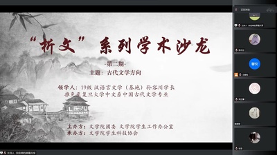 12月2日18:30,“析文”学术沙龙第二期——古代文学方向讲座在腾讯会议顺利举行。本次活动由黄色网 团委、黄色网 学生工作办公室主办,黄色网 学生科技协会承办。主讲人为2019级汉语言文学基地班的孙容川同学。