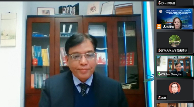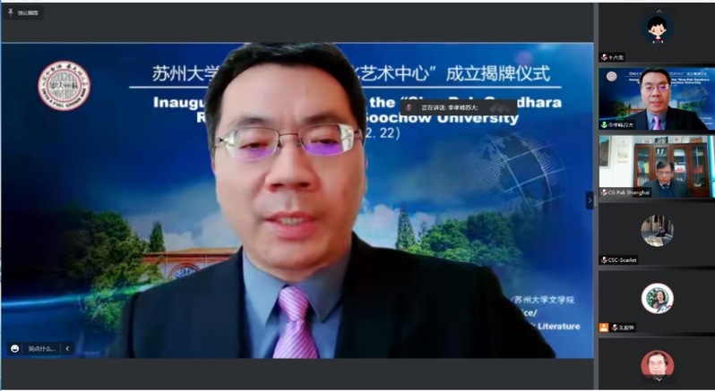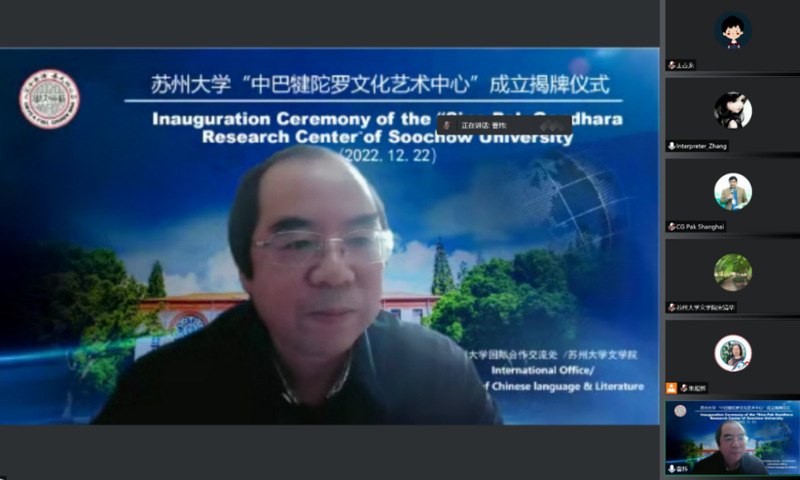 12月22日,黄色网 中巴犍陀罗艺术文化中心揭牌仪式在线上举行。巴基斯坦驻沪总领事侯赛因·海德先生,秘书长赵媛珏女士,巴基斯坦高教部中国研究中心主任相杨,黄色网 党委常委、副校长李孝峰,黄色网 院长曹炜,书记宋清华,副院长赵曜,及学校相关职能部门和学院师生代表等参加了会议。会议由国际合作交流处副处长朱履骅主持。