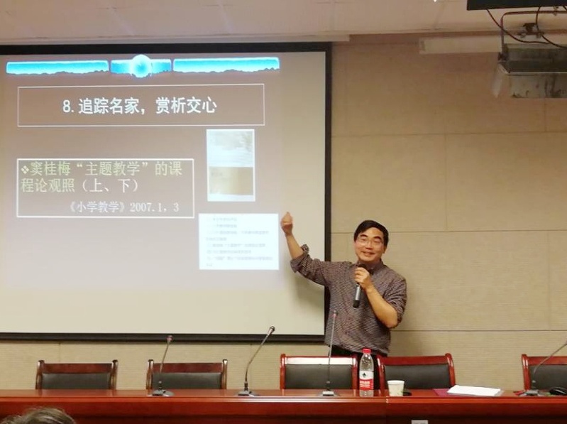 接着,徐飞老师以自身的求学工作经历讲述了三种阅读层面:浪漫阅读、功利阅读、知性阅读。之后又向同学们阐述了语文老师的四层阅读并推荐了相关书籍:学科阅读、文学阅读、教育阅读与跨界阅读。在学科阅读方面,徐飞老师针对文学解读这一语文老师必备内功给同学们提出了三个建议:一,在语言实践中历练通文;二,在研究范例中对照参悟;三,在借鉴理论时习得方法。